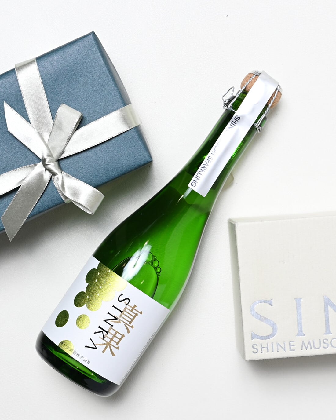 【 ※贈答用 】 第三弾 SINKA-真果-しんか (シャインマスカットスパークリングワイン) 2025年夏収穫したシャインマスカットを使用したSINKAを、贈答用としてご購入いただく方に最適なラッピング数種類と熨斗をご用意。 イベント用、お世話になった方へのお礼や、お誕生日のギフト、ご結婚やご出産後の内祝いなどに最適な商品です。
